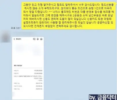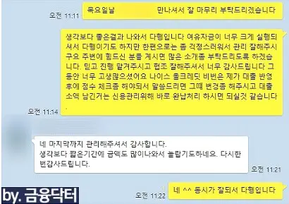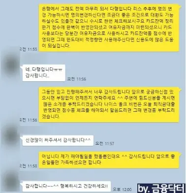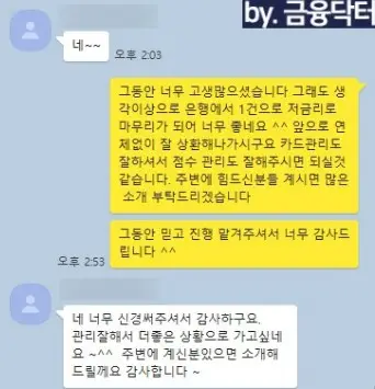 - 성과 분석: 신용점수 상승 및 조건에 따라 신규 금융사를 안내해드리고 신규로 대출을 신청합니다.